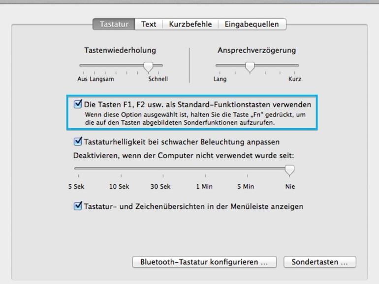 Denn dazu muss lediglich in den Systemeinstellungen unter Tastatur die Option „Die Tasten F1, F2 usw. als Standard-Funktionstasten verwenden“ aktiviert werden. Möchten Sie nun die Helligkeit verringern oder erhöhen oder aber den Ton einstellen, benötigen Sie für diese Funktionen die fn-Taste. In anderen Apps, in denen die FN-Tasten mit Funktionen belegt sind, wird [fn] nun aber nicht mehr benötigt.