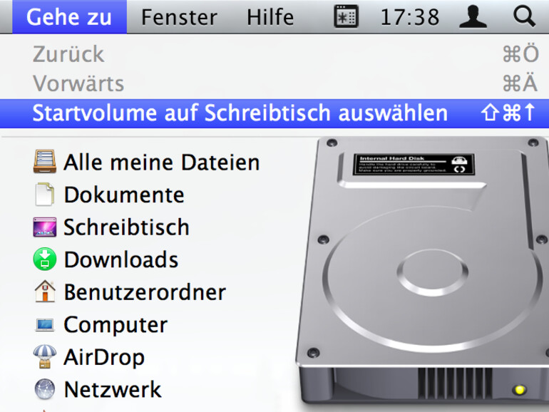 Wird im Finder die cmd-Taste und die Pfeiltaste nach oben gedrückt, findet ein Wechsel in den darüberliegenden Ordner statt. Fügt man dieser Kombination jedoch die Shift-Taste hinzu, wechselt der Menü-Eintrag auf Startvolume auf Schreibtisch auswählen. Mit einem Doppelklick oder cmd+Pfeiltaste nach unten öffnet sich dann die Partition.