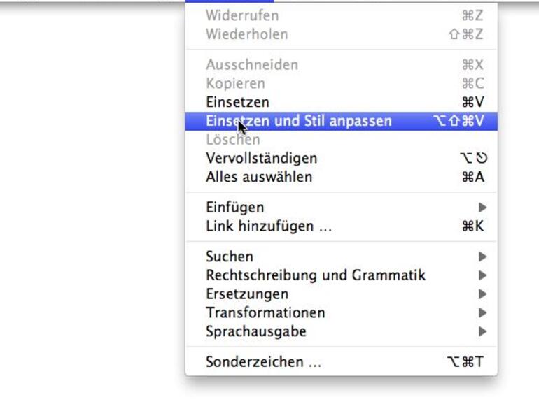 Um dies zu verhindern, wählen Sie stattdessen den Befehl Einsetzen und Stil anpassen. Dann erhält der Text die Formatierung des bestehenden Text-Dokuments. Diesen Tipp können Sie – neben TextEdit – auch bei anderen Textverarbeitungsprogrammen wie Pages 4 oder Bean 2.4.x anwenden.