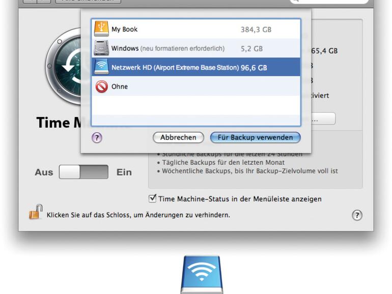 In der Seitenleiste klicken Sie nun auf den Computernamen und anschließend doppelt auf das Netzwerk-Symbol. Jetzt erscheint das Symbol der AirPort Extreme Base Station. Nun erfolgt ein erneuter Doppelklick auf dieses Symbol, und danach wählen Sie im Fenster rechts oben den Schalter Verbinden als aus. Nun geben Sie das Kennwort Ihrer AirPort Extreme Base Station ein. Die angeschlossene Festplatte wird jetzt als Netzwerk HD angezeigt. Durch einen Doppelklick auf das Symbol wird die Festplatte als blaues Laufwerkssymbol auf dem Schreibtisch dargestellt. Anschließend können Sie über die Systemeinstellungen von Time Machine und den Schalter Volume wechseln diese Festplatte auswählen. Beachten Sie, dass die USB-2-Festplatte gegebenenfalls neu formatiert wird.