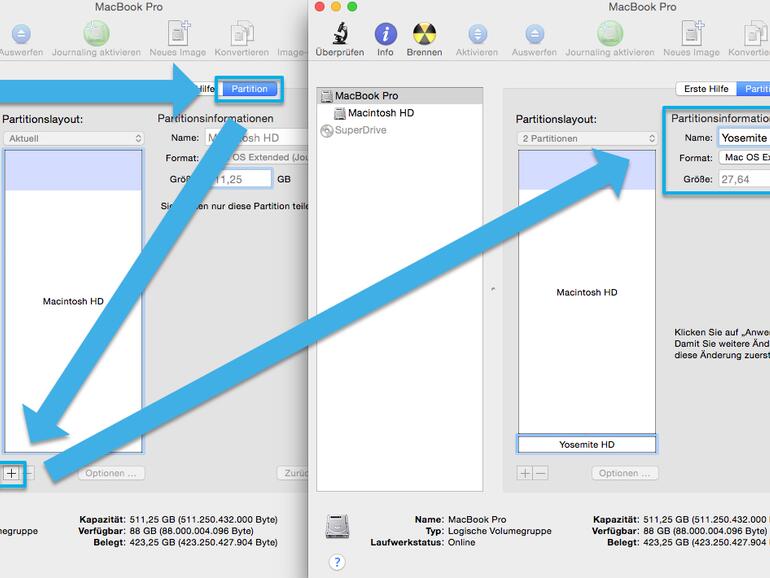Zur Erstellung einer neuen Partition für Yosemite öffnen Sie das Festplattendienstprogramm im Dienstprogramme-Ordner in den Programmen. Klicken Sie oben links auf die Festplatte und anschließend rechts auf Partition. Über das Plus-Symbol unterhalb des Partitionslayouts können Sie eine neue Partition anlegen. Diese in etwa 25 Gigabyte groß sein. Mit einem Klick auf Anwenden wird die Partitionierung gestartet.