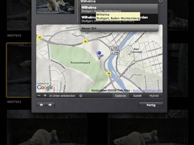 Mit dem Schalter „Stecknadel setzen" ist es möglich, den Ort auch visuell über die Google-Maps zu suchen und zu markieren.