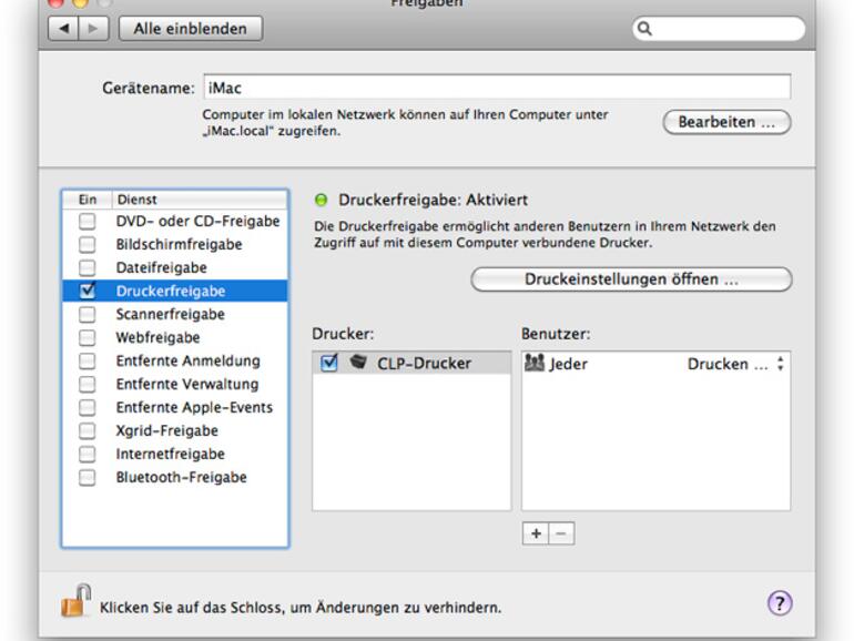 Wählen Sie nun in den Systemeinstellungen unter Freigaben den Punkt Druckfreigaben, und setzen Sie dort ein Häkchen.