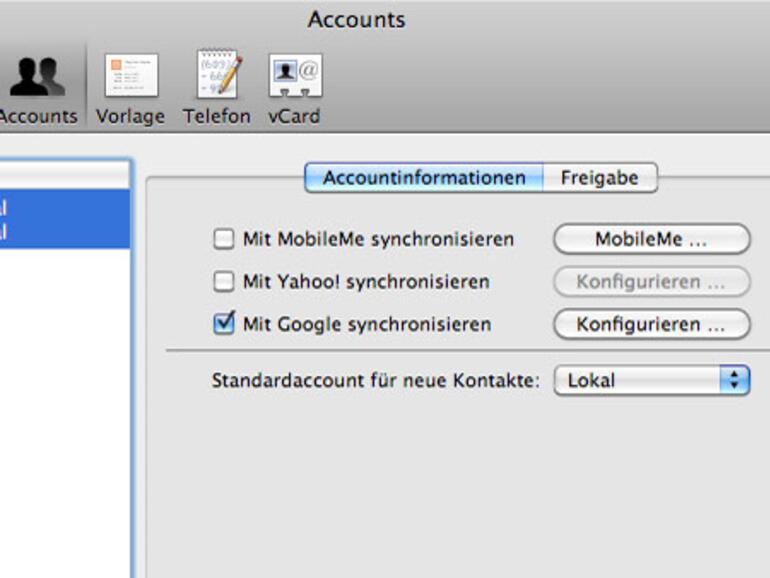 Trotzdem kann es praktisch sein, den Adressbestand des Rechners mit einem Online-Adressbuch abzugleichen, schon für den Fall, dass man versehentlich alle Kontaktdaten verliert, aber auch, um beim Schreiben einer Mail direkt auf diese Kontakte zuzugreifen. Obendrein erspart es Ihnen die Arbeit, Kontakte aus Ihrem E-Mail-Dienst ins Adressbuch-App einzupflegen. Das Adressbuch ermöglicht den automatischen Sync mit den weit verbreiteten E-Mail-Diensten von Yahoo! und Google: Öffnen Sie dazu einfach die Adressbuch-Einstellungen, und wählen Sie den Punkt Accounts. Dort finden sich rechts Einträge für den Abgleich von MobileMe, Yahoo Mail und Google Mail. Klicken Sie auf Konfigurieren, und geben Sie im folgenden Fenster Ihre Kontaktdaten an. Ab sofort gleicht das Adressbuch alle Einträge mit den E-Mail-Diensten ab.
