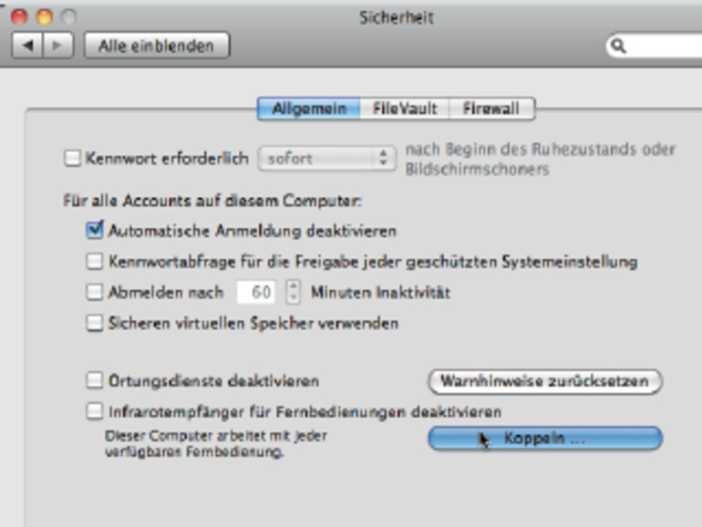 Anschließend klicken Sie auf den Schalter Koppeln … Um die neue Apple Remote nun mit dem Mac zu verbinden, richten Sie die Fernbedienung mit dem schwarzen Markierung an der Oberseite auf den Infrarotempfänger Ihres Mac aus.