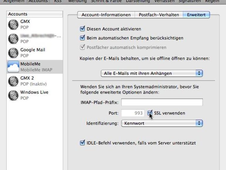 Sorgen Sie daher dafür, dass beim Abrufen und Empfangen von E-Mails via Apple Mail – die so genannte SSL(Secure Sockets Layer)-Verschlüsselung aktiviert wurde. Dazu öffnen Sie die Einstellungen von Apple Mail, wählen im Register Accounts das entsprechende E-Mail-Konto aus und markieren im Register Erweitert die Einstellung SSL verwenden. Selbstverständlich muss die SSL-Verschlüsselung auch vom E-Mail-Provider unterstützt werden, damit dies möglich ist.