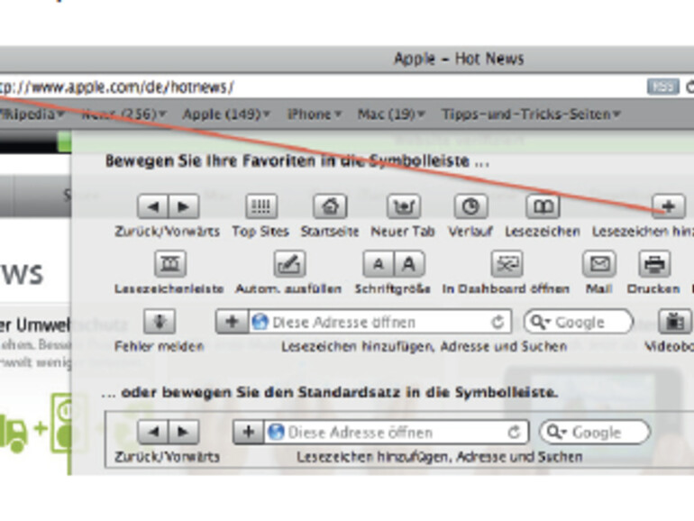 Nun ziehen Sie das Symbol Lesezeichen hinzufügen in die Symbolleiste von Safari. Daraufhin verschwindet das entsprechende Symbol aus der Adressleiste. Um den Ursprungszustand später wiederherzustellen, ziehen Sie einfach den vorgefertigten Standardsatz an Symbolen wieder in die Symbolleiste.