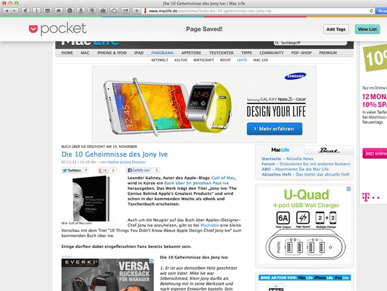 Der Lesezeichen-Dienst „Pocket“ ist vergleichbar mit Konkurrenz-Angeboten wie „Instapaper“ oder „Evernote“. Sie erstellen mit dem Dienst eine Liste von Lesezeichen und Internet-Artikeln, die Sie zu einem späteren Zeitpunkt lesen möchten. Mit der passenden Safari-Erweiterung erhalten Sie einen eigenen Knopf in der Symbolleiste des Browsers. Damit speichern Sie die aktuell aufgerufene Internetseite in Ihrem Pocket-Konto. Dazu hinterlegen Sie Ihre Zugangsdaten einmalig in den Einstellungen. Beim Hinzufügen können Sie auch Schlagworte vergeben. Danach ist es auch möglich, direkt in Ihre Pocket-Leseliste zu wechseln. Die Erweiterung blendet dazu eine Verknüpfung zu Ihrem Pocket-Profil ein.