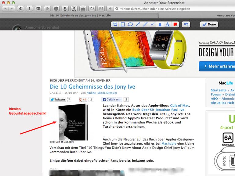 Mit „Awesome Screenshot“ erweitern Sie den Safari-Browser um eine simple Schnappschuss-Funktion. Sie können damit entweder eine ganze Internetseite als Bild speichern oder nur den sichtbaren Teil. Egal wie Sie sich entscheiden, der Schnappschuss öffnet sich in einem neuen Tab. Praktisch: Sie können das Bildschirmfoto auch bearbeiten, Formen wie Rechtecke, Kreise, Linien und Pfeile hinzufügen oder einen Teil aus dem großen Bild herausschneiden. Das Verpixeln von Bildelementen ist ebenso möglich wie das Hinzufügen von Text. Nach der Bearbeitung haben Sie zwei Möglichkeiten, das Ergebnis zu nutzen: Entweder Sie speichern das Bild lokal auf Ihrem Rechner, oder Sie laden es ins Netz hoch. Nach dem Hochladen erhalten Sie den Link zu Ihrem Bild und können das Ergebnis direkt in sozialen Netzwerken wie Twitter oder Facebook verteilen. Leider gibt es keine Möglichkeit, die Bilder aus dem Netz zu löschen. Für Bilder mit privaten Informationen eignet sich die Erweiterung also weniger. Wer aber nur einen schnellen Schnappschuss anfertigen möchte, greift zu dieser Erweiterung.