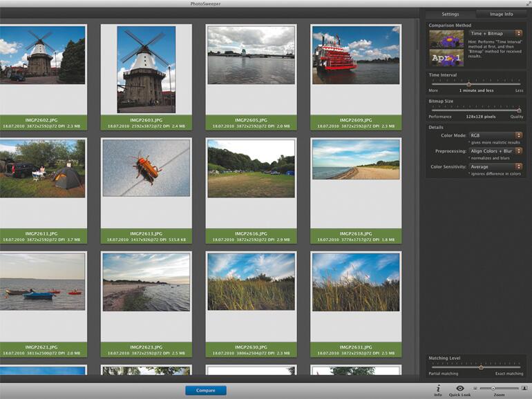 Für den Bildvergleich sieht sich PhotoSweeper das Erstellungsdatum, den Inhalt des Bildes sowie die Farb- und Helligkeitsverteilung, also das sogenannte Histogramm an. Worauf das Programm achten soll, stellen Sie vor der Suche per Aufklappmenü ein. Um die Bildanalyse zu beschleunigen, untersucht das Programm nicht die Bilder selbst. Dazu erstellt es vor der Analyse kleine Vorschaubilder, sogenannte Bitmaps, die es anschließend analysiert. In unserem Test brachte die Einstellung „Bitmap“ eine etwa doppelt so hohe Trefferquote wie bei der Wahl von „Histogramm“. Die jeweils gefundenen Bilder stimmten jedoch nicht immer überein, sodass es lohnend sein kann, die Methoden nacheinander auszuführen. Praktisch: Per Schieberegler verändern Sie die Treffergenauigkeit und verringern oder vergrößern somit in Sekundenschnelle die Trefferliste.