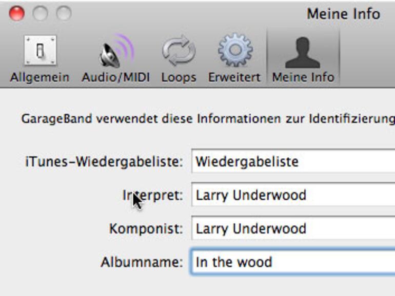 Dort wählen Sie das Register Meine Info. Hier geben Sie nun den Namen des Interpreten, des Komponisten sowie gegebenenfalls des Albums und der iTunes-Wiedergabeliste ein.