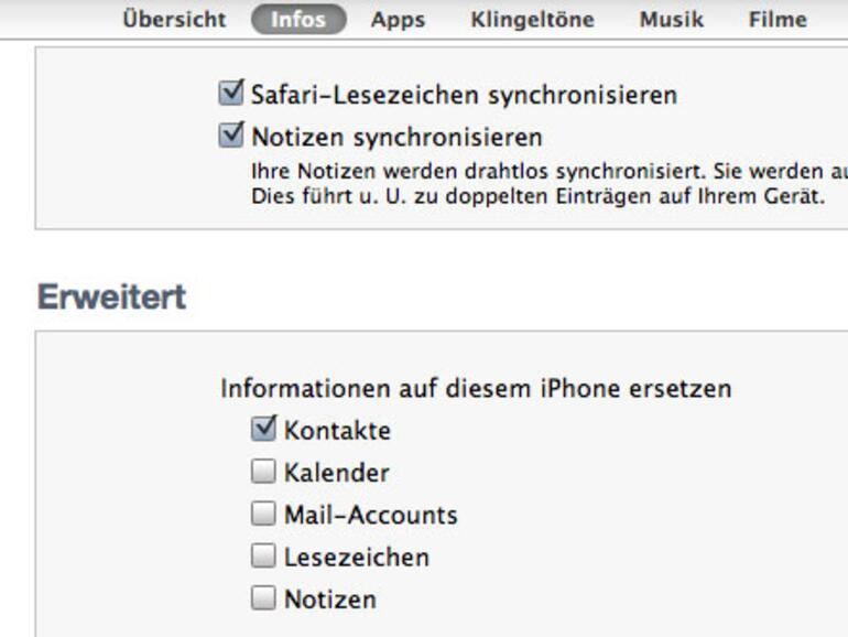 Es kann also nach einer größeren Löschaktion sinnvoll sein, einmalig alle Kontakte auf iPhone, iPad und Co mit denen des Rechners zu überschreiben. Öffnen Sie dazu – bevor Sie das iOS-Gerät anschließen – die Einstellungen von iTunes, und setzen Sie im Tab Geräte einen Haken bei Automatische Synchronisierung von iPods, iPhones und iPads verhindern, um die automatische Synchronisierung abzuschalten. Schließen Sie danach Ihre iOS-Geräte an, wählen Sie sie in der iTunes-Seitenleiste aus, und klicken Sie auf das Tab Infos. Dort müssen Sie bis ganz unten hinunterscrollen und im Abschnitt Informationen auf diesem iPhone ersetzen den Punkt Kontakte anklicken. Starten Sie danach die Synchronisation: Der Stand der Rechnerdaten ist ab sofort wieder identisch mit denen auf dem iPhone, und die ewigen Rückläufer haben ein Ende. Anschließend können Sie die Einstellungen wieder rückgängig machen. Bei anderen Handys, die Sie etwa mit iSync oder einem beliebigen anderen Sync-Tool abgleichen, könnte es schwieriger werden. Grundsätzlich hilft es aber, vor dem Sync alle Kontakte auf dem Handy zu löschen, um wieder den gleichen Zustand wie auf dem Rechner zu erreichen. Neue Kontakte sollten aber tunlichst vorher einzeln per vCard – etwa per E-Mail – übertragen werden.