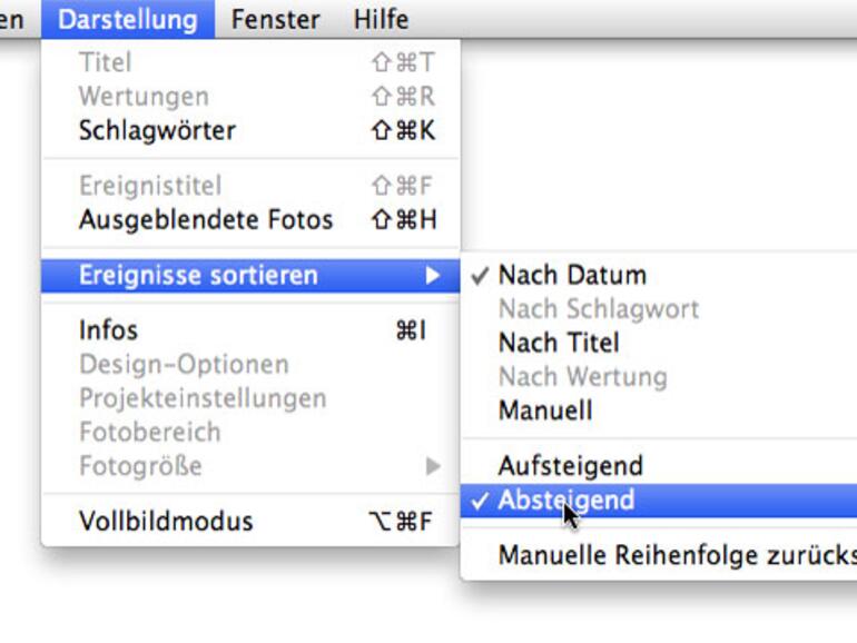Öffnen Sie dazu iPhoto und dann die Menüs Darstellung sowie Ereignisse sortieren. Dort markieren Sie zuerst die Option Nach Datum und dann Absteigend. Von nun an finden Sie Ihre aktuellsten Fotos immer am Anfang der Ereignisliste.