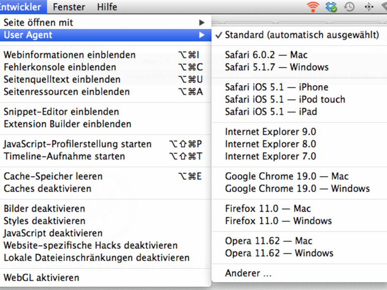 Die Möglichkeit, den User Agent zu ändern, ist aber besonders für Entwickler interessant: Zwar wird durch einen anderen User Agent aus Safari kein Opera, aber zumindest die Umleitungen lassen sich testen. Das sieht offenbar auch Apple so und hat die User-Agent-Auswahl in das Entwickler-Menü integriert.