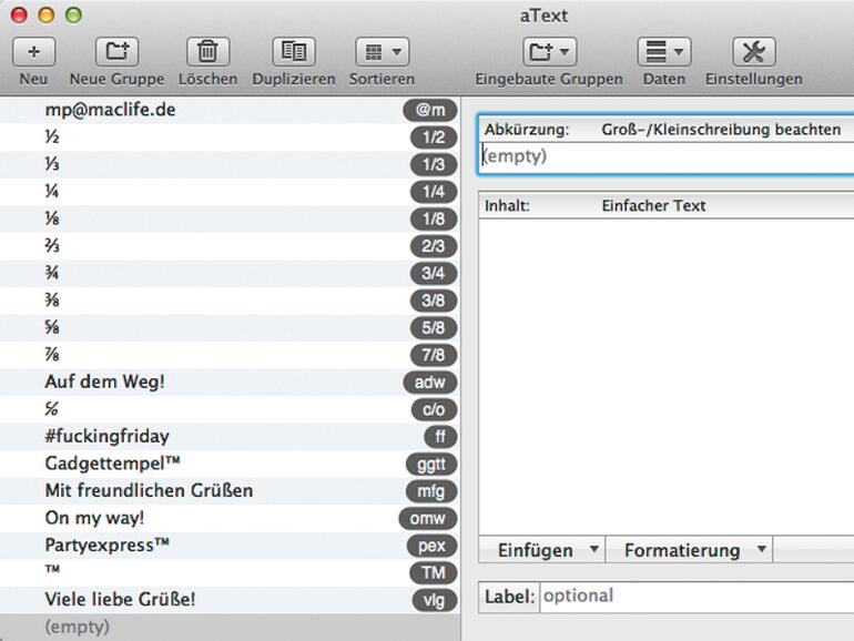 Unabhängig davon, ob Sie Aufsätze oder Gutachten schreiben und per E-Mail kommunizieren, im Tagesverlauf schreibt man häufig die gleichen Dinge. Textbausteine können Ihnen daher helfen, bestimmte Passagen schneller einzufügen. Auf diese Weise haben Sie komplizierte Fachtermini oder Standardfloskeln schnell zur Hand. Sei es zum Beispiel die Grußformel in einem Brief oder in ihrem Metier gebräuchliche Begriffe, deren Abkürzungen geschwind getippt sind. Ergänzend zur Autokorrektur in Ihrem Textprogramm und im Betriebssystem nutzen Sie Textbausteine zur Korrektur von geläufigen Tippfehlern wie vertauschten Buchstaben. Gründe für ein Hilfsprogramm wie aText gibt es einige, obwohl durch OS X Mavericks eine vergleichbare Funktion bereits vorhanden ist: Im Kontrollfeld „Tastatur“ finden Sie unter „Text“ die Kurzbefehle aus dem iOS als Systemfunktion. Allerdings stören sich aText und Systemfunktion aber nicht. aText stellt vielmehr eine produktive Ergänzung dar. So lassen sich mit dem Programm auch Variablen wie das aktuelle Datum oder ein Zeitstempel einfügen.