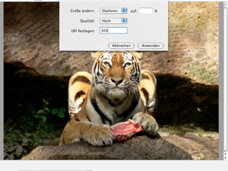 Eine interessante Funktion des Colorsync-Dienstprogrammes ist es, Digitalfotos, die meist in 72 dpi (Bildpunkte pro Zoll) vorliegen, zum Beispiel auf 300 dpi „hochzurechnen", falls die Weiterverwendung dies erforderlich macht. Natürlich ist damit auch ein gewisser Qualitätsverlust verbunden, das Colorsync-Dienstprogramm liefert jedoch ein sehr brauchbares Ergebnis. Dazu öffnen Sie das Foto und Klicken in der Symbolleiste auf das zweite Symbol von rechts zum Verändern der Bildgröße. In dem nun erscheinenden Fenster geben Sie die gewünschten Parameter ein, zum Beispiel 300 dpi und Skalierung von 75%. Über die Befehle Ablage, Speichern oder Exportieren können Sie das Foto speichern oder in ein anderes Format konvertieren.