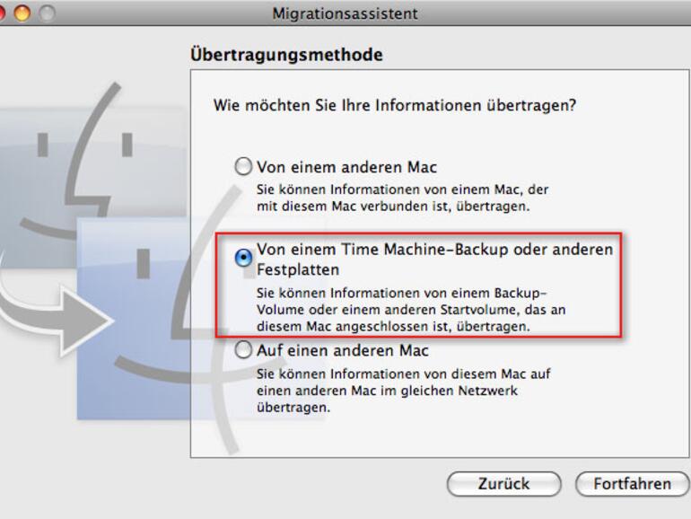 Wählen Sie in beiden Fällen im Migrationsassistenten die zweite Option Von einem Time-Machine-Backup und anderen Festplatten aus und gehen Sie dann wie gewohnt vor.