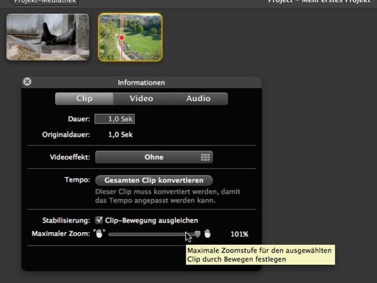 Dies kann je nach Länge des Clips und der Geschwindigkeit des Macs einige Zeit in Anspruch nehmen. Um den Clip dann endgültig zu stabilisieren, öffnen Sie ihn in der Projekt-Mediathek mit einem Doppelklick und aktivieren im Fenster Information die Einstellung Clip-Bewegung ausgleichen. Über den Zoom-Regler können Sie einstellen, wie stark die Verwackelungen ausglichen werden sollen.