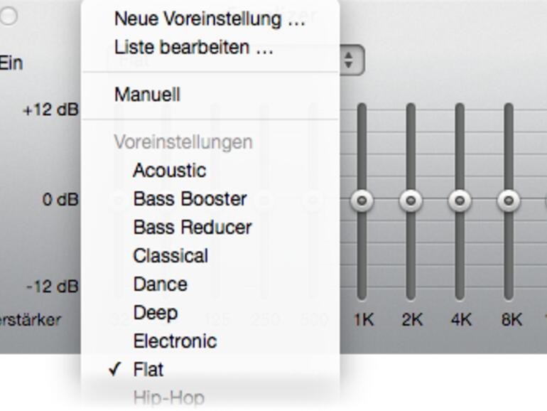 Deutlich mehr Einfluss auf die Wiedergabe haben Sie über den in iTunes integrierten Equalizer. Unter Fenster und Equalizer oder per cmd+alt+2 stellt Apple einen Satz Regler zur Verfügung. Alternativ können Sie auch über die Voreinstellungen für mehr Bass oder klarere Stimmen sorgen.